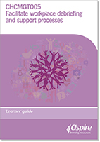 CHCMGT005 Facilitate workplace debriefing and support processes Release 2 describes the skills and knowledge required to monitor and support workers. This includes implementing support processes to manage stress and emotional wellbeing of self or colleagues working in varied health and community service contexts. It also involves facilitating structured debriefing sessions to colleagues following incidents with the potential to impact on health and wellbeing. It includes information on how to: